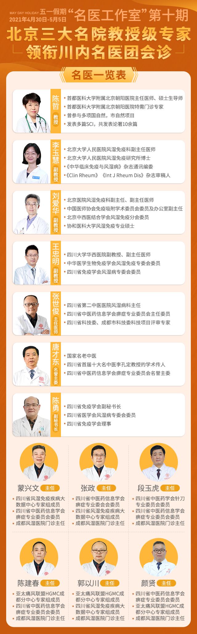 此次北京三大名院教授级专家领衔川内名医团会诊,将由首都医科大学朝阳医院陈哲教授、北京大学人民医院李玉慧副教授、卫生部直属北京医院刘爱华副教授联合四川大学华西医院王忠明副教授、四川省中医药信息学会痹症专委会主任委员张世俊主任医师等川内专家为预约前来的患者进行“多对一”看诊服务。