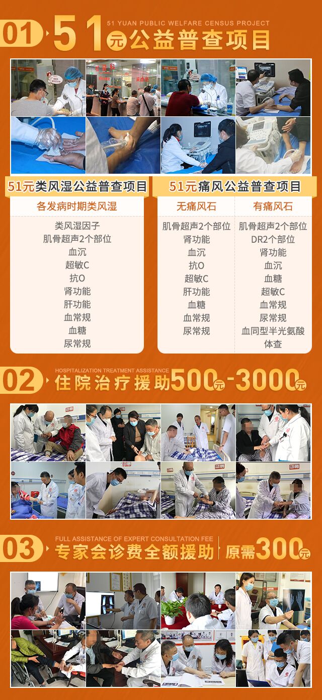 惠民补贴“五一”关爱劳动者,针对痛风风湿确诊及抗复发治疗关键性数据指标,我院优化所需检查和治疗项目,在4月30日-5月5日期间,进行适当援助补贴。(注:本次活动专家会诊费用、部分检测费用和专项治疗费用由四川省风湿免疫疾病大数据中心补贴。)