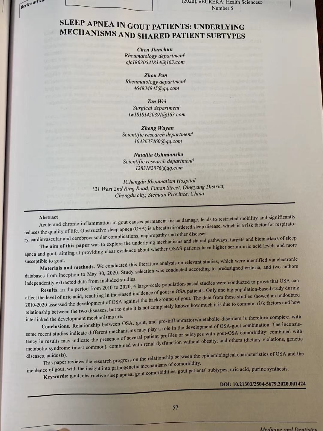 论文名:《阻塞性睡眠呼吸暂停综合征与痛风发病风险的研究进展》