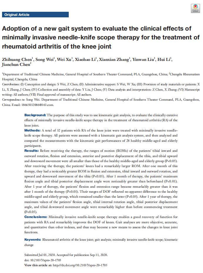 论文名:SCI论文《采用新的步态系统评估微创针刀镜治疗膝关节类风湿关节炎》