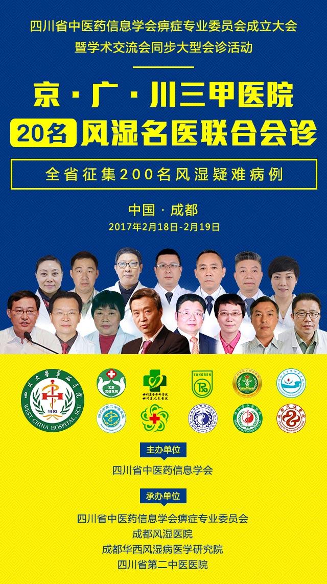为落实医疗卫生体制改革“分级诊疗、重心下移”的政策,缓解风湿免疫性疾病患者看病难、挂号难的问题,成都风湿医院携手来自四川大学华西医院、首都医科大学附属北京同仁医院、四川省人民医院、首都医科大学北京友谊医院、广州军区总医院、川北医学院附属医院、四川省第二中医院、成都中医药大学附属医院、绵阳市中医院等多家三甲医院20名风湿免疫疾病医生,于2月18日至19日开展风湿免疫性疾病大型会诊活动,每日仅限100名,预约从速。