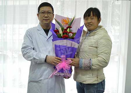 (图:治疗后的王女士送来鲜花并与陈建春主任合影留念)