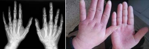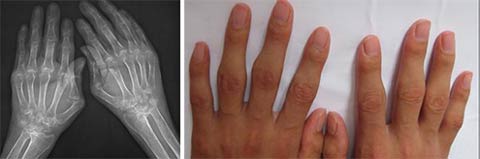 医生会诊结果:双肘关节肿胀,关节周围压痛(+),双肘关节活动受限。双手呈尺偏畸形,2、 3、4、5手指呈鹅颈畸形。