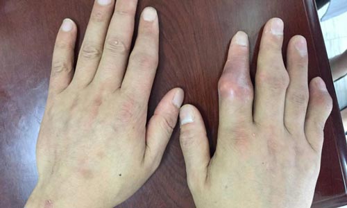 第二个疗程治疗结束后,王先生的双脚踝浮肿现象消失,右大脚趾的痛风结节开始溶解,双手痛风石溶解,双足背红肿热痛已基本缓解;